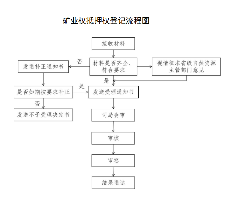 自然资源部政务大厅接收申请人报送的矿业权抵押权登记申请资料。申请材料齐全、符合法定形式的,或者申请人按照登记管理机关的要求提交全部补正申请材料的,应当受理登记申请。