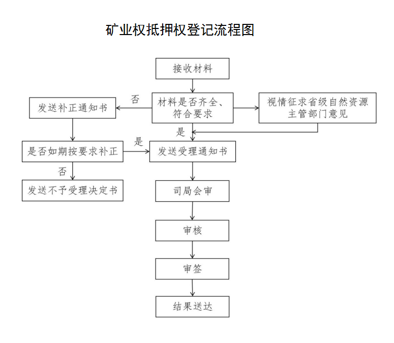 自然资源部政务大厅接收申请人报送的矿业权抵押权登记申请资料。申请材料齐全、符合法定形式的,或者申请人按照登记管理机关的要求提交全部补正申请材料的,应当受理登记申请。