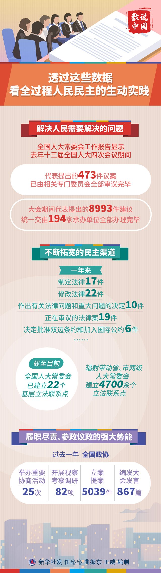 翻开提请审议的全国人大常委会工作报告、全国政协常委会工作报告,其中的一组组数据,跃动着民主的生机活力,彰显全过程人民民主的实践逻辑、独特优势。
