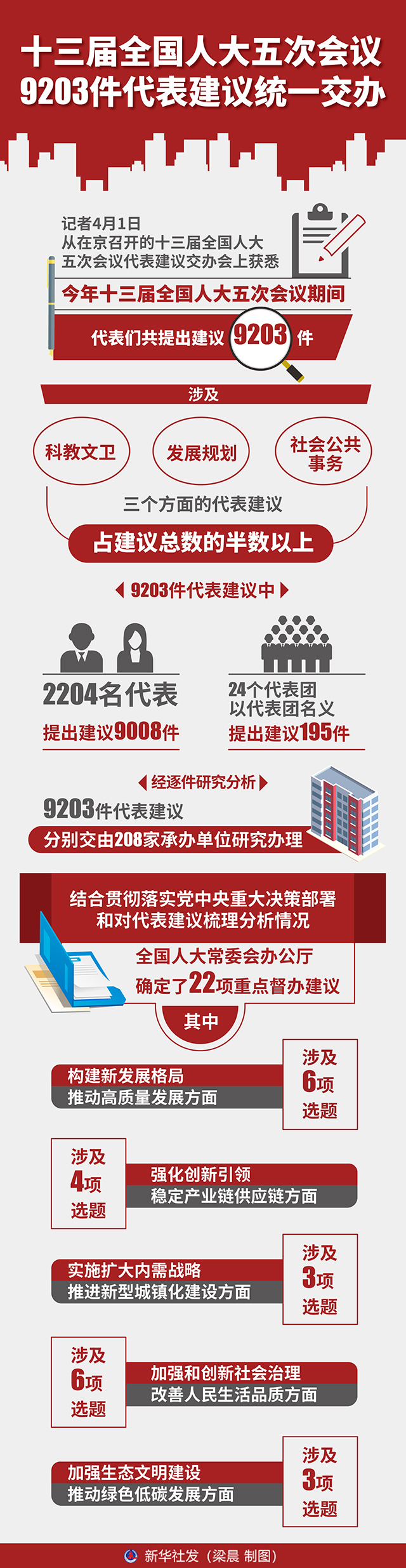记者4月1日从在京召开的十三届全国人大五次会议代表建议交办会上获悉,今年十三届全国人大五次会议期间,代表们共提出建议9203件。其中,2204名代表提出建议9008件,24个代表团以代表团名义提出建议195件。经逐件研究分析,9203件代表建议分别交由208家承办单位研究办理。