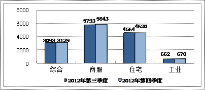 地价水平总体平稳,较上一季度略有上涨。2012年第四季度,全国主要监测城市地价总体水平为3129元/平方米,商服、住宅、工业地价分别为5843元/平方米、4620元/平方米和670元/平方米。