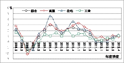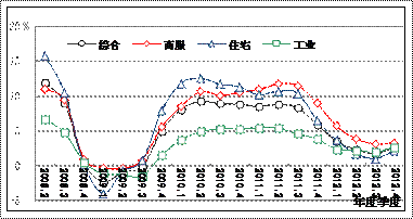 地价同比增速由降转升,整体处于低位。第四季度末,全国主要监测城市综合、商服、住宅、工业地价同比增长率分别为2.61%、3.34%、2.26%、2.70%,地价同比增速开始加快,较上一季度分别上升了0.84、0.19、1.23、和0.70个百分点,是继2011年底增速连续五个季度回调以来的首次由降转升,但地价年度涨幅仍处于近十年来的历史低位,仅略高于2008年。