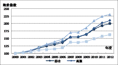 图4 2000-2012年重点城市分用途平均地价指数