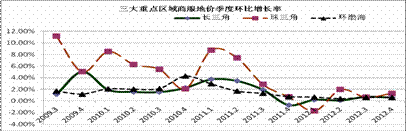 (二)三大重点区域综合地价走势与全国相同,珠江三角洲地区综合地价环比、同比增长率高于全国和其他两大重点区域平均水平
