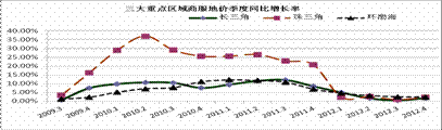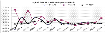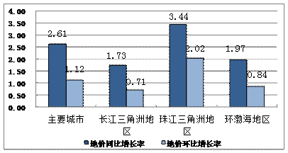 从同比增长率看,三大重点区域综合地价同比增速由五个季度连续放缓转为回升态势。其中,珠江三角洲地区增速最快,为3.44%,较上一季度上升了2.22个百分点,长江三角洲和环渤海地区增速分别为1.73%、1.97%,分别较上一季度上升了1.41和0.55个百分点。