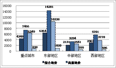 2012年第四季度,全国重点城市中,地价水平呈东高、西次、中低的布局。东部地区平均地价高于全国和中西部地区平均水平,西部与中部地区平均地价水平较为接近且均低于全国重点城市平均水平。