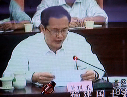 2008年4月9日下午15:00,全国汛期地质灾害防治工作视频会议召开。图为福建省国土资源厅厅长黄琪玉发言。(杨征 摄)