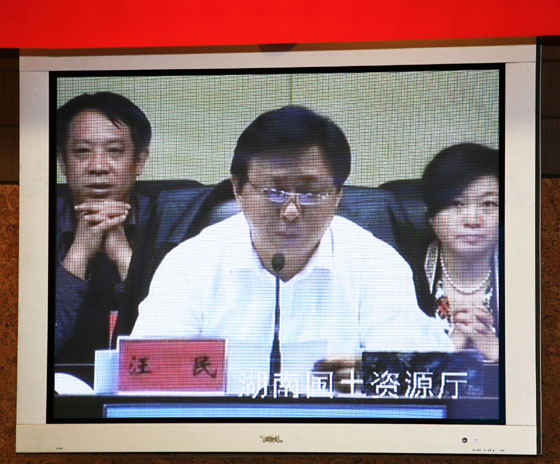 2010年5月20日下午,国土资源部召开全国稀土等矿产开发秩序专项整治行动视频会议。国土资源部党组成员、副部长汪民出席(湖南分会场)会议并发表重要讲话。(图像为会议视频画面。陶伟 摄)