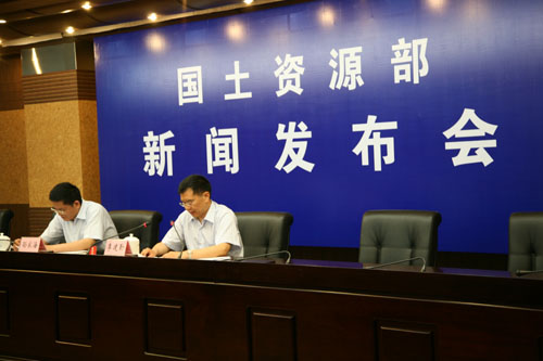 2010年6月17日(星期四)上午10:00 国土资源部召开2009年度土地卫片执法检查工作新闻发布会。图为新闻发布会主席台 (陶伟 摄)