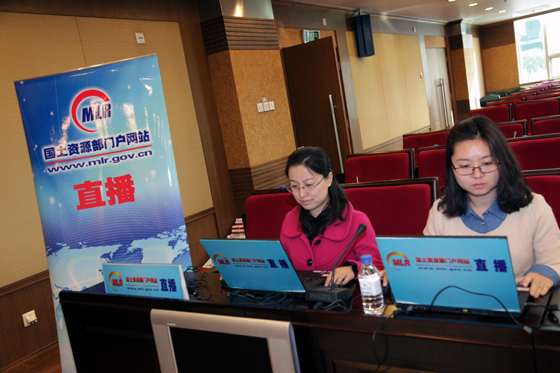 2012年11月1日上午,国土资源部召开《东北地区油气资源动态评价成果》成果新闻发布会。图为国土资源部门户网站工作人员进行直播准备。(于洪奇 摄 谢敏 编)