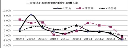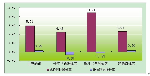 从环比增长率看,三大监测区域的综合地价环比增速均呈回落态势,长江三角洲、珠江三角洲地区自2009年下半年以来,首次出现负增长。相对而言,尽管较上一季度下降了0.65个百分点,环渤海地区仍以0.30%的增速位居第一。