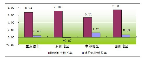 从环比增长率看,东降、中升、西稳的态势与以往有所不同。东部地区综合地价增长率较上一季度下降1.47个百分点,达到-0.07%;中部地区综合地价增长率长期以来首次超过西部,为1.21%,较上一季度上升了0.05个百分点;西部地区则以0.59%的增长率稳定微升。