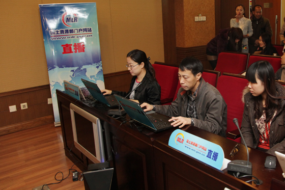2012年12月18号上午,国土资源部举行“采取切实措施 稳定房地产用地供应 抑制异常地价”有关工作情况的新闻通气会。图为国土资源部门户网站工作人员进行网上直播。(赵心浩 摄 谢敏 编)