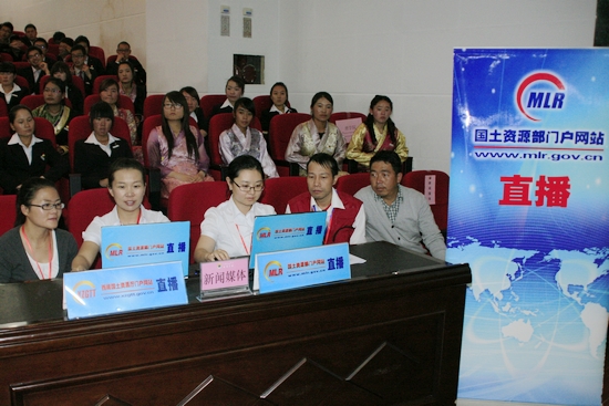 2012年8月25日,2011年度国家科技进步奖特等奖“青藏高原地质理论创新与找矿重大突破”奖金捐赠暨西藏大学地学优秀学生奖学基金设立仪式在西藏大学举行。图为国土资源部门户网站编辑人员正在做直播前准备工作。(赵心浩 摄 杨征 编)