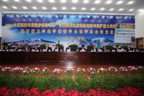 2012年8月25日,2011年度国家科技进步奖特等奖“青藏高原地质理论创新与找矿重大突破”奖金捐赠暨西藏大学地学优秀学生奖学基金设立仪式在西藏大学举行。图为捐赠仪式主席台。