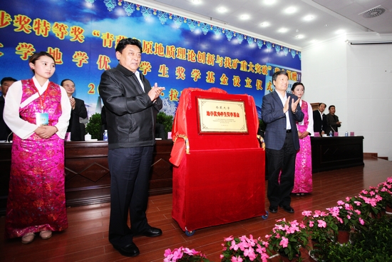 2012年8月25日,2011年度国家科技进步奖特等奖“青藏高原地质理论创新与找矿重大突破”奖金捐赠暨西藏大学地学优秀学生奖学基金设立仪式在西藏大学举行。图为国土资源部徐绍史部长和西藏自治区白玛赤林主席为西藏大学地学优秀学生奖学基金设立揭牌。(于洪奇 摄 杨征 编)