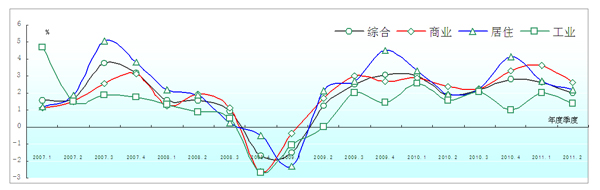 2011年第二季度,在政府严厉的楼市调控政策持续推进的背景下,商品住房交易量下降,交易价格有所松动,受间接影响,各用途地价增速较上一季度均有所放缓。全国商业、居住、工业地价环比增幅分别为2.77%、2.17%、1.13%,较上一季度分别下降了0.56、0.27和0.30个百分点。由于政府对商品住宅交易的严格限制,投资持续转向商业地产,全国商业地价环比、同比的增长率均为最高。
