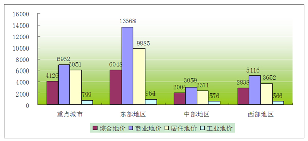 2011年第二季度,全国重点城市中,东部地区综合地价平均水平最高,为6048元/平方米,明显高于全国和中、西部地区重点城市平均水平;中部地区综合地价水平均低于全国和东部地区重点城市平均水平,为2004元/平方米;西部地区综合地价水平高于中部地区,但远低于全国和东部地区,为2838元/平方米。
