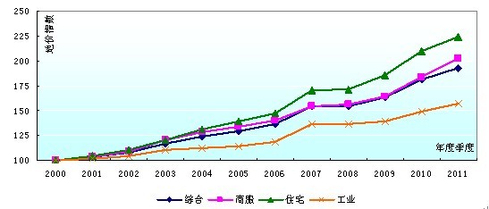 以2000年为基期的重点城市平均地价指数持续上升,2011年末,综合、商服、住宅、工业地价指数分别达到193、202、224、157。