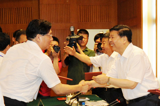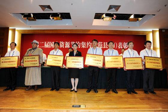 2013年6月25日,第二届国土资源节约集约模范县(市)表彰会在浙江省绍兴市召开,图为主席台领导为获奖代表颁奖。(潘峪 摄 谢敏 编)