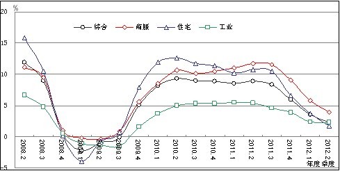 2012年第二季度,商服、住宅、工业地价环比变化均呈微幅波动态势。其中,商服地价环比增速较上一季度下降了0.51个百分点,住宅地价环比增长率止跌回升,工业地价环比增速较上一季度上升了0.38个百分点。各用途同比增速连续四个季度回调,但本季度回调幅度小于前两个季度,商服、住宅、工业分别较上一季度下降了1.81、1.93、0.12个百分点。本季度,尽管住宅地价同比增速持续放缓,但受货币和地方房地产政策微调等因素的间接影响,全国住宅平均地价整体微升。
