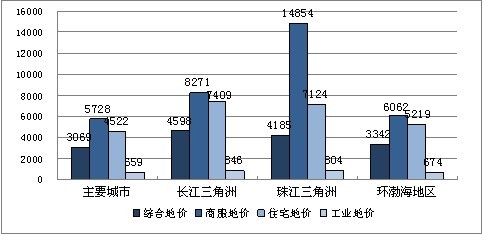 2012年第二季度,三大重点区域综合地价水平均高于全国总体情况,呈小幅上升态势。长江三角洲、珠江三角洲、环渤海地区综合地价水平分别为4598元/平方米、4185元/平方米、3342元/平方米。