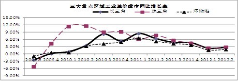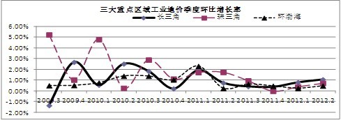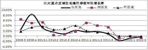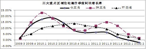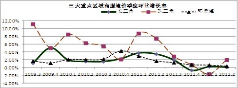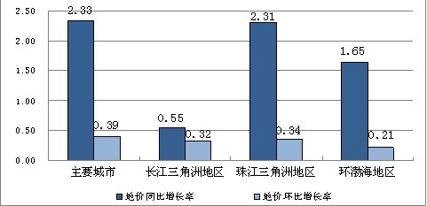 从环比增长率看,三大重点区域增幅保持在0.50%以内,分别较上一季度加快了0.29、0.33和0.04个百分点,其中,环渤海地区的增速相对较小。