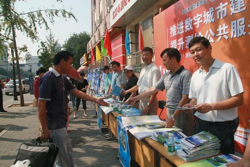 该院在羊坊店路设立宣传站,悬挂横幅,摆设展板,提供咨询服务,发放《北京市旅游交通图》等测绘宣传材料,现场循环播放多媒体宣传片《北测之旅——与首都同行》、《三维地理信息服务》,吸引了广大市民和过往路人驻足观看。院领导一同参加活动,走上街头向群众宣传测绘法,讲解测绘法的有关内容,并同工作人员一起向过往群众发放北京市六环地图、院简介等宣传资料。宣传日当天,共发放各种宣传资料3000多份,制作展出了测绘在城市发展与人民生活中发挥作用的地理信息应用服务专题宣传展板10块。