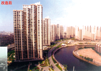 按照土地利用总体规划控制城市建设用地,促进了旧城改造和城市土地集约利用,产生了显著的经济效益、环境效益和社会效益。本图展示的是上海市一角旧城改造前后面貌。