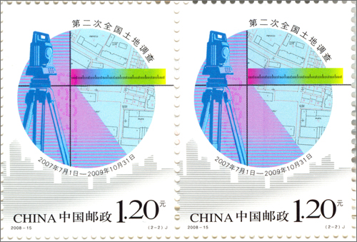 《第二次全国土地调查》纪念邮票,共一套2枚。邮票采用简练的设计手法,将卫星遥感以及地面测量等科学手段与影像图形相结合,直观,准确地表达了第二次全国土地调查的主题。