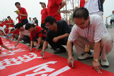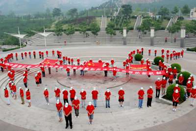 6月22日,在缝山针公园广场排列成中国地图形状的150人,身穿印有“依法行政严格执法”文化杉,在“保护耕地、爱我家园”“中国加油、奥运加油、四川加油”的高呼声中,河南省焦作市全社会参与的“土地日”宣传活动拉开了帷幕。