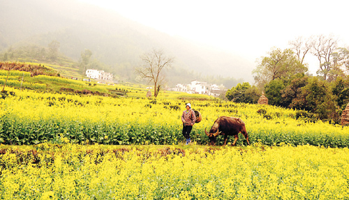 一场透的春雨使得猫在地上一冬的油菜起身了。于是乡村满世界就呈现出一片片鲜黄鲜黄的颜色,像是爆发,更像是炫耀。