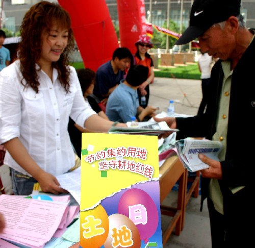 6月25日,银川市国土资源局的工作人员在向市民发放“土地日”宣传资料。当日,宁夏举行大型宣传咨询服务活动,纪念第17个全国“土地日”。今年“土地日”宣传主题 是“节约集约用地,坚守耕地红线”。新华社发(张万静 摄)