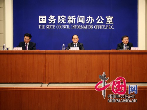 国务院新闻办公室于2009年6月23日(星期二)上午10时举行新闻发布会,请国土资源部副部长、党组副书记、国家土地副总督察鹿心社和国家土地副总督察、部党组成员甘藏春介绍“保经济增长、保耕地红线”行动进展与成效等方面情况,并答记者问。图为“保经济增长、保耕地红线”行动进展情况发布会主席台。